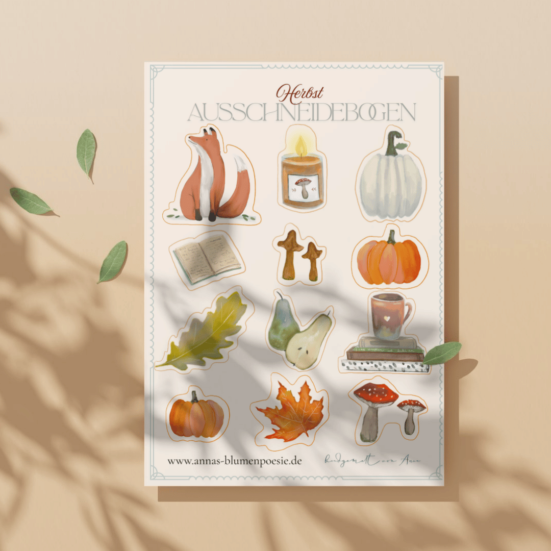 Dieser wunderschöne Ausschneidebogen ist von Anna selbst illustriert und mit viel Liebe gestaltet. Die Datei wird dir nach dem Kauf als Download zur Verfügung gestellt. Du kannst sie einfach herunterladen, ausdrucken und die Motive mit etwas Rand ausschneiden. Das Schöne daran: Mit einem kleinen Faden versehen kannst du daraus Mobilés oder eine hübsche Herbstgirlande gestalten, nimmst du aber einen Zahnstocker und klebst ihn auf die Rückseite der Motive, hast du wundervolle Herbst Cupcake Stecker oder dekorierst deine Pflanzen und Töpfe mit den hübschen Illustrationen.